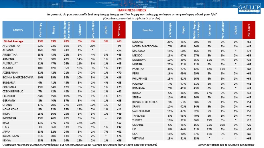Los más felices, según su autoevaluación, son los habitantes de Colombia (83% se declara feliz), Kazajstán (81%), Albania (74%), Malasia (78%) y Nigeria (78%). Los más infelices son los habitantes de Afganistán (el 36% se declara infeliz o muy infeliz), Ghana, Irak (31%), Ucrania (31%), Turquía (23%), Pakistán (23%) y Rusia (23%).