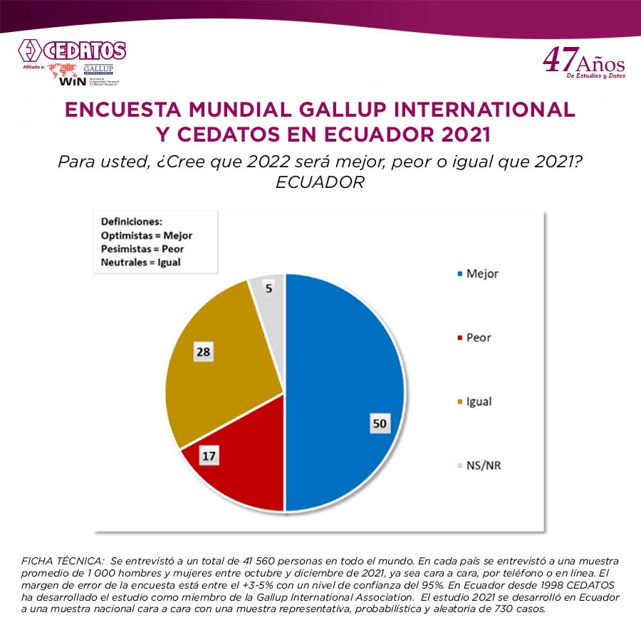A medida que se acerca el final de 2021, hay esperanzas de un futuro mejor en todo el mundo, aunque no se alcancen los altos niveles medidos hace algunos años. El 38% de la población mundial piensa ahora que 2022 será mejor que 2021, el 28% espera un año peor y el 27% cree que 2022 será igual que 2021. El panorama es similar al de finales de 2020. 2008 sigue siendo el año con mayor pesimismo en todo el mundo en el nuevo siglo. En Ecuador los consultados se muestran positivos y esperanzados, ya que un 50% espera que sea mejor; sólo un 17% piensa que será peor. El 28% considera que la situación en el Ecuador permanecerá igual que el 2021.