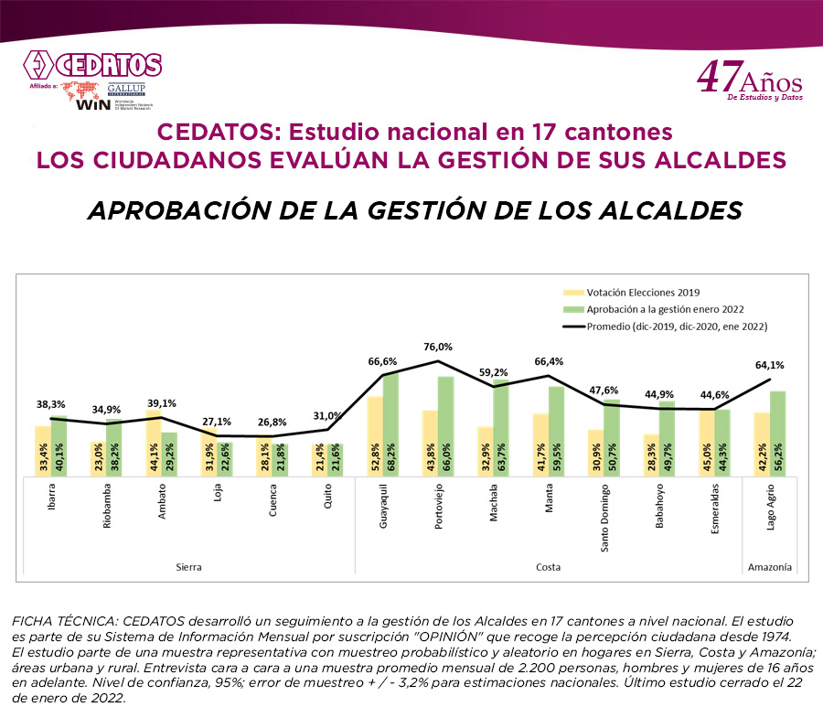 FICHA TÉCNICA: CEDATOS desarrolló un seguimiento a la gestión de los Alcaldes en 17 cantones a nivel nacional. El estudio es parte de su Sistema de Información Mensual por suscripción «OPINIÓN» que recoge la percepción ciudadana desde 1974. El estudio parte de una muestra representativa con muestreo probabilístico y aleatorio en hogares en Sierra, Costa y Amazonía; áreas urbana y rural. Entrevista cara a cara a una muestra promedio mensual de 2.200 personas, hombres y mujeres de 16 años en adelante. Nivel de confianza, 95%; error de muestreo + / – 3,2% para estimaciones nacionales. Último estudio cerrado el 22 de enero de 2022.