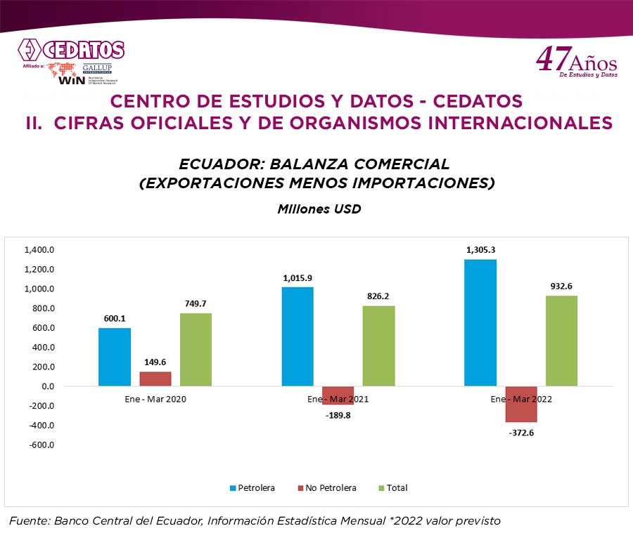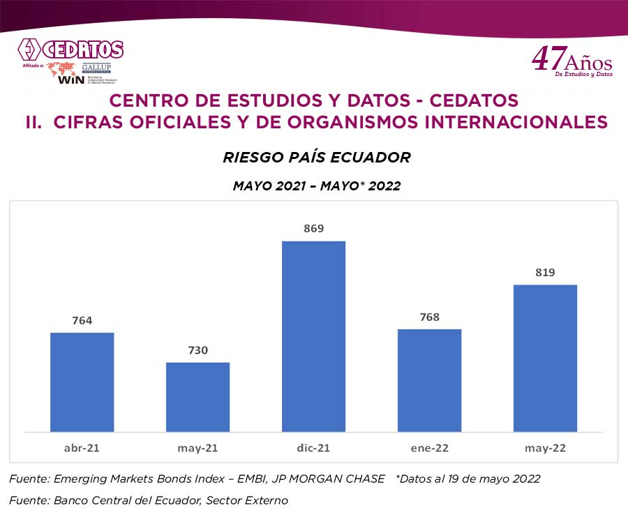 Se complementa este INFORME con CIFRAS OFICIALES DEL EUADOR Y OTROS PAISES cuyas fuentes son: Banco Central; INEC; Ministerios del Ecuador; y, de otros países: Fondo Monetario Internacional; Emerging Markets Bonds Index – EMBI, JP MORGAN CHASE *Datos a mayo 19 2022. Banco Central del Ecuador, Sector Externo.
