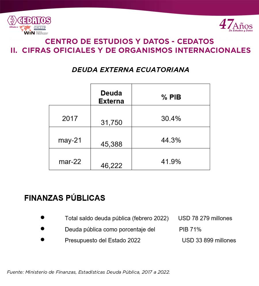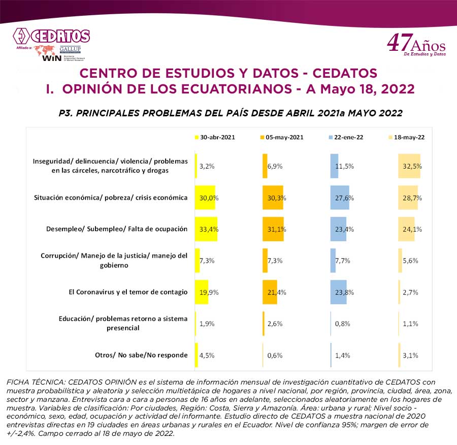 CEDATOS presenta información sobre el desenvolvimiento del país desde 2017 a 2022 y durante el primer año del gobierno del Presidente Lasso a partir de la opinión de la población tomada en un promedio de 20 ciudades del país en encuestas nacionales, áreas urbanas y rurales. Este estudio se complementa con una comparación de la situación del país en el contexto de América Latina, con cifras oficiales del Ecuador y de organismos internacionales.