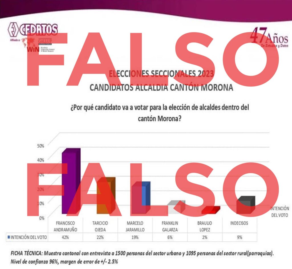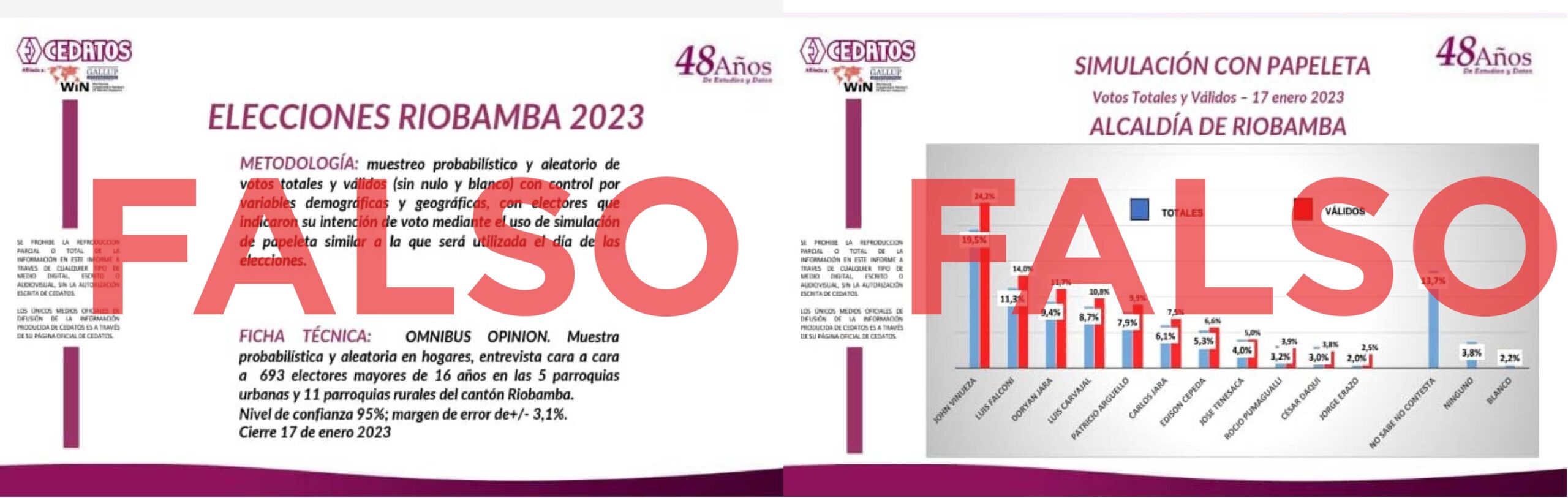Cedatos no autoriza el uso de su imagen corporativa y la difusión de los documentos falsos con título » ELECCIONES RIOBAMBA 2023 / SIMULACIÓN CON PAPELETA ALCALDÍA DE RIOBAMBA » y » ELECCIONES SECCIONALES 2023 CANDIDATOS ALCALDÍA CANTÓN MORONA » que circula en redes sociales y medios de comunicación. Este documento ha sido denunciado oficialmente al CNE.