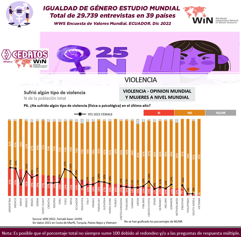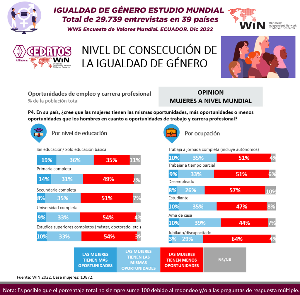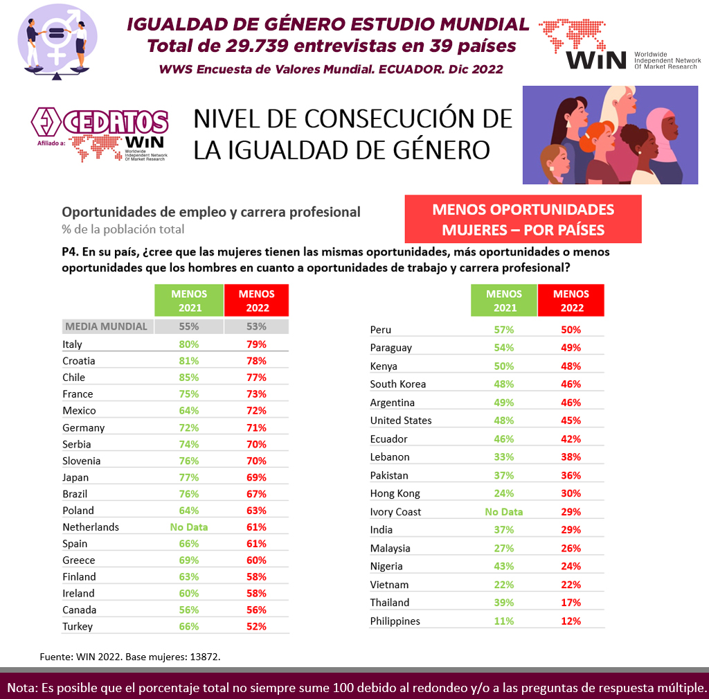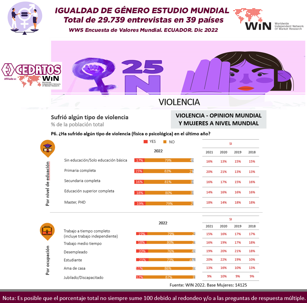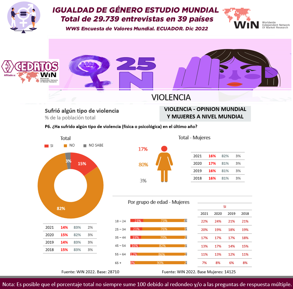 WIN International, la asociación líder mundial en investigación de mercado y encuestas, ha publicado la Encuesta Mundial Anual WIN – WWS 2022 – que explora las opiniones y creencias de 28.702 encuestados en 39 países de todo el mundo. CEDATOS como representante de la Red Mundial de Investigación de Mercados y Opinión Pública en el Ecuador, desarrolló con motivo del Día Internacional de la Mujer, un estudio sobre Igualdad de género, violencia y acoso sexual, para comprender cuáles son, si las hay, las mejoras en todo el mundo en términos de igualdad de oportunidades y derechos.