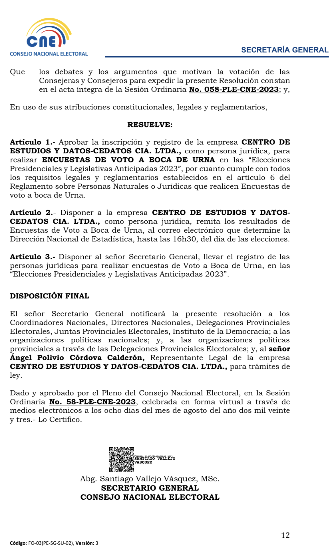 PLENO CNE AUTORIZA A CEDATOS PARA REALIZAR EXIT POLL