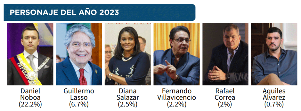También Fernando Villavicencio (+, 2,2 %), Rafael Correa (2 %) y Aquiles Álvarez (0,7 %) son considerados personajes importantes del año. El 0,4 % incluye en esa lista al capo del narcotráfico Leandro Norero (+).