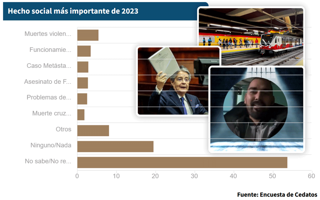 En esa lista también se incluye el funcionamiento del metro de Quito (3,4 %), los problemas de la justicia (2,5 %), la crisis económica (1,8 %) y el aumento de la migración (1,5 %) como los hechos sociales más importantes de 2023, de acuerdo con la encuesta.