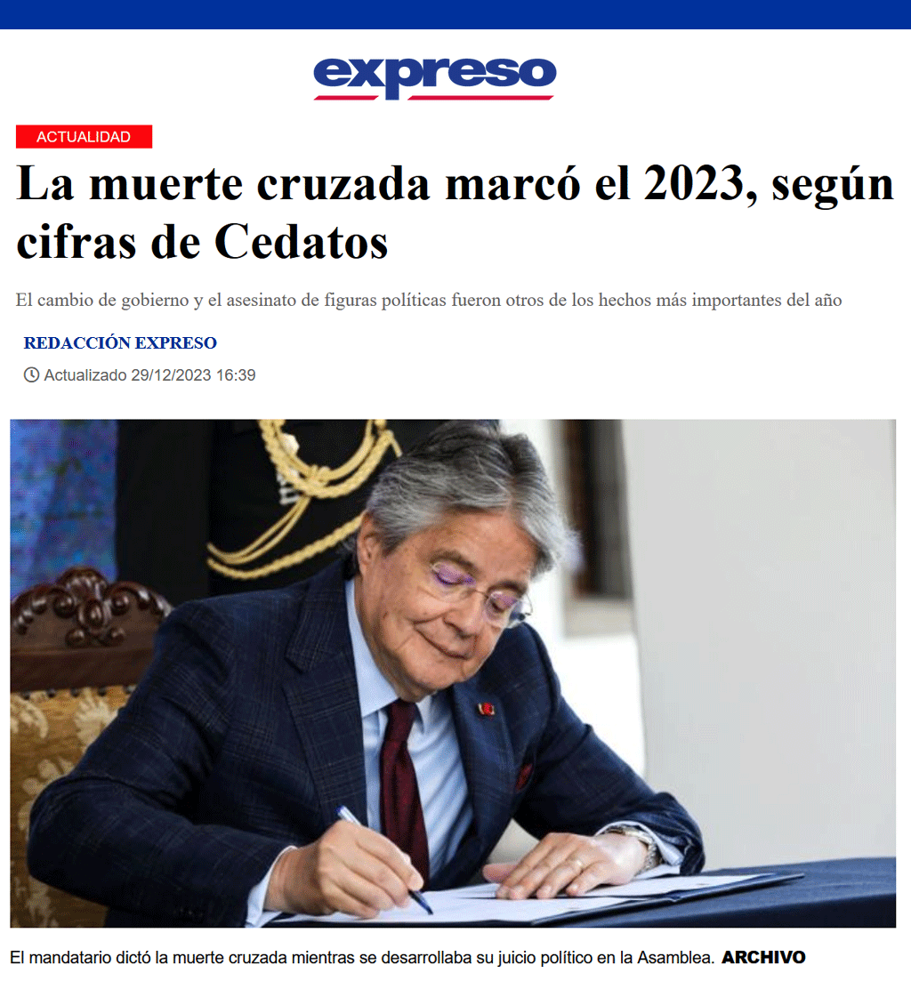 Un año políticamente movido. Según cifras de Cedatos, la declaratoria de muerte cruzada (23,9 %) a manos del expresidente Guillermo Lasso fue el hecho más importante en materia política de 2023.