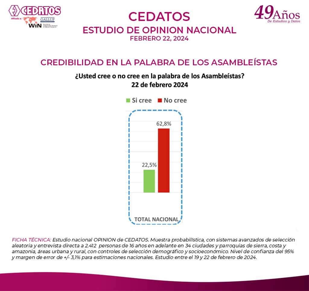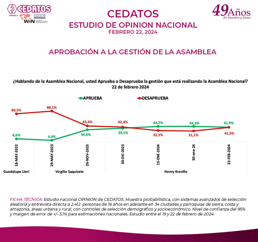 La gestión de la Asamblea Nacional, según la encuesta terminada el 22 de febrero de 2024, alcanzó el 41.9%; la desaprobación fue del 41.5%. El 16.6% no opinó al respecto. La credibilidad en la Asamblea Nacional fue de 22.5 %. En comparación a años anteriores, en mayo de 2023, la aprobación de la gestión según la población entrevistada por CEDATOS fue del 8.3% y la credibilidad de 4.1%.