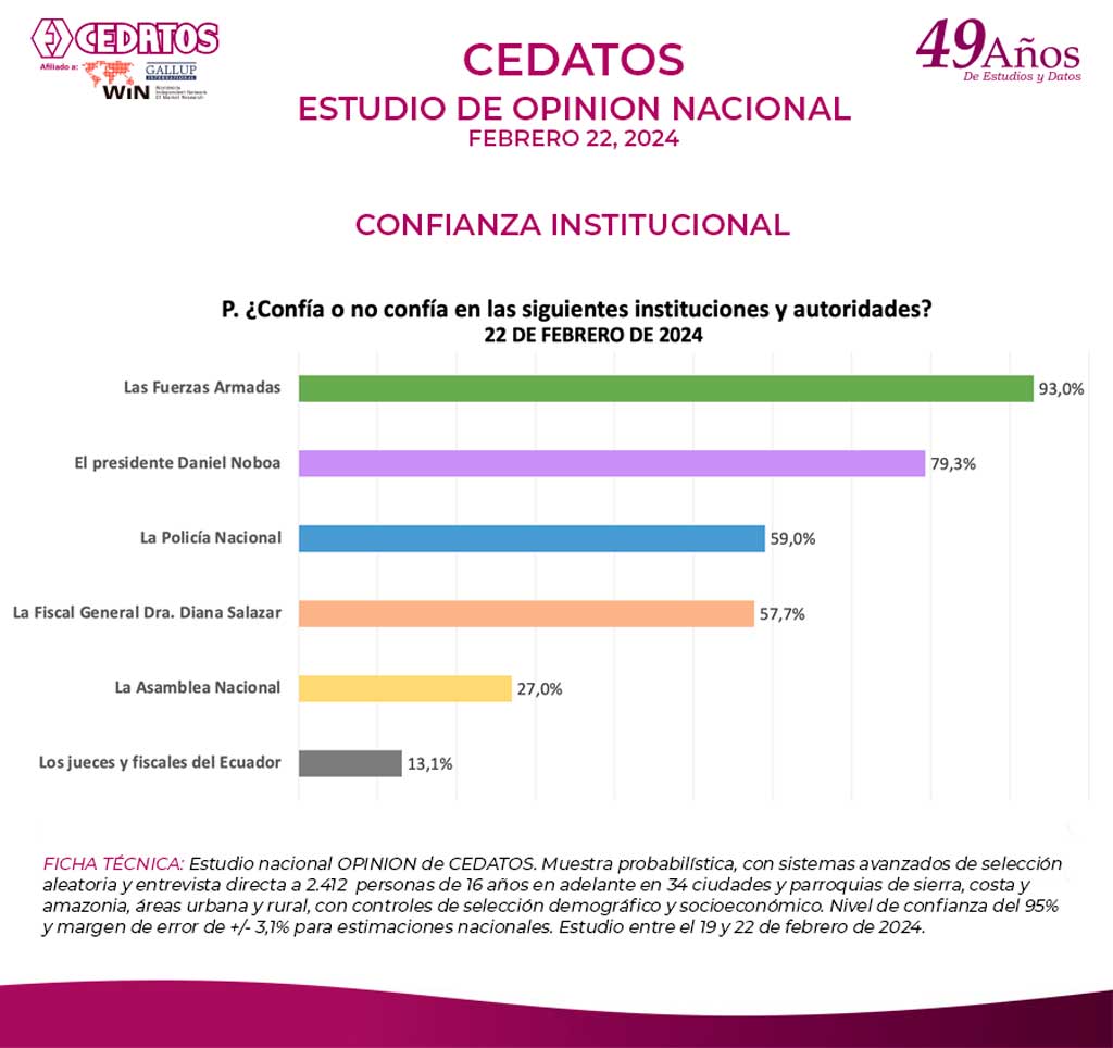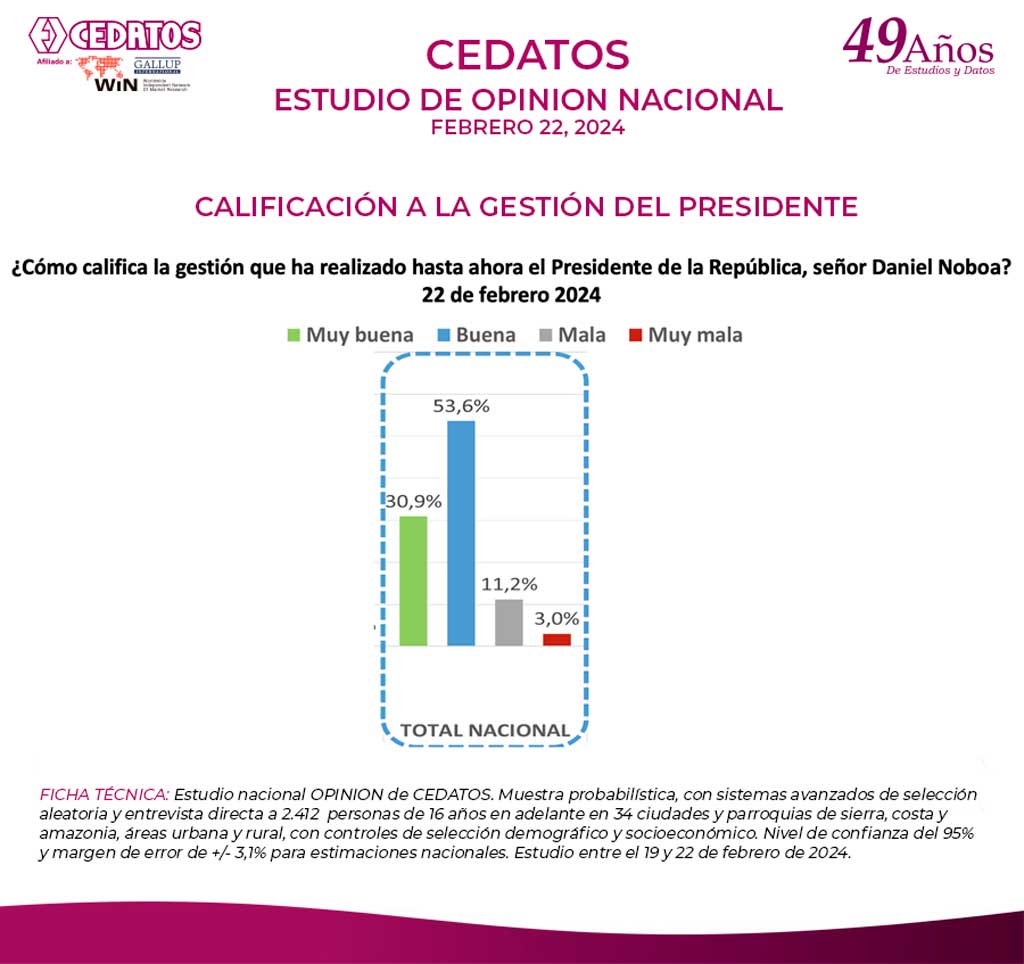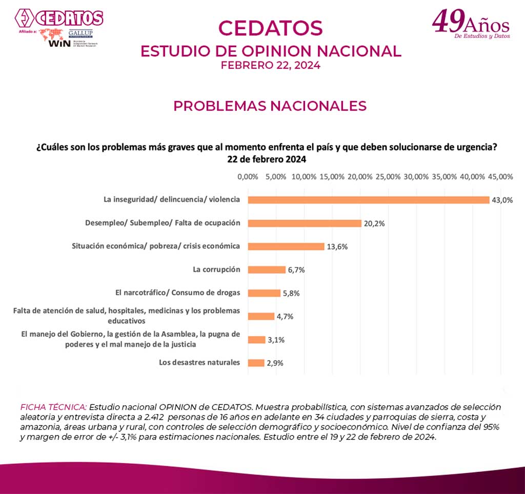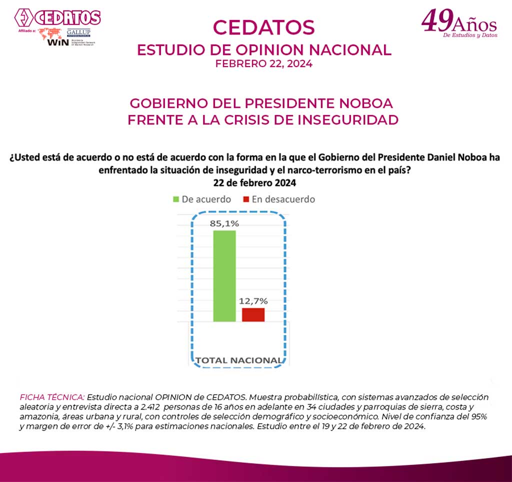 FICHA TÉCNICA: Estudio nacional OPINION de CEDATOS. Muestra probabilística, con sistemas avanzados de selección aleatoria y entrevista directa a 2.412 personas de 16 años en adelante en 34 ciudades y parroquias de sierra, costa y amazonia, áreas urbana y rural, con controles de selección demográfico y socioeconómico. Nivel de confianza del 95% y margen de error de +/- 3,1% para estimaciones nacionales. Estudio entre el 19 y 22 de febrero de 2024.