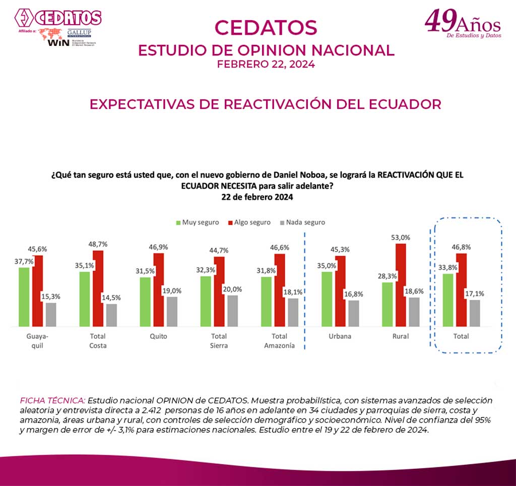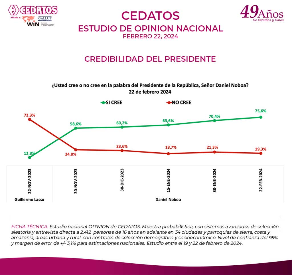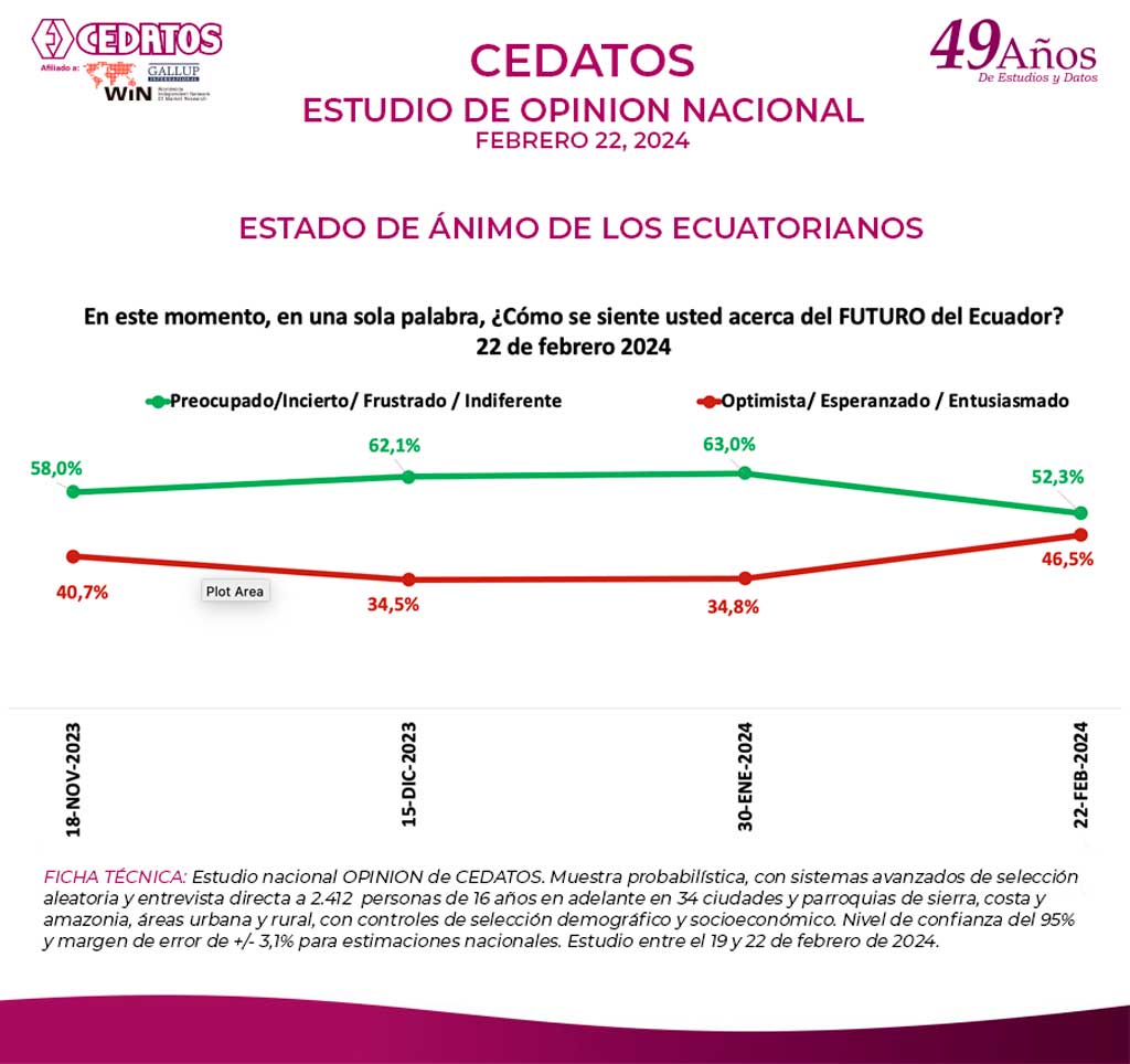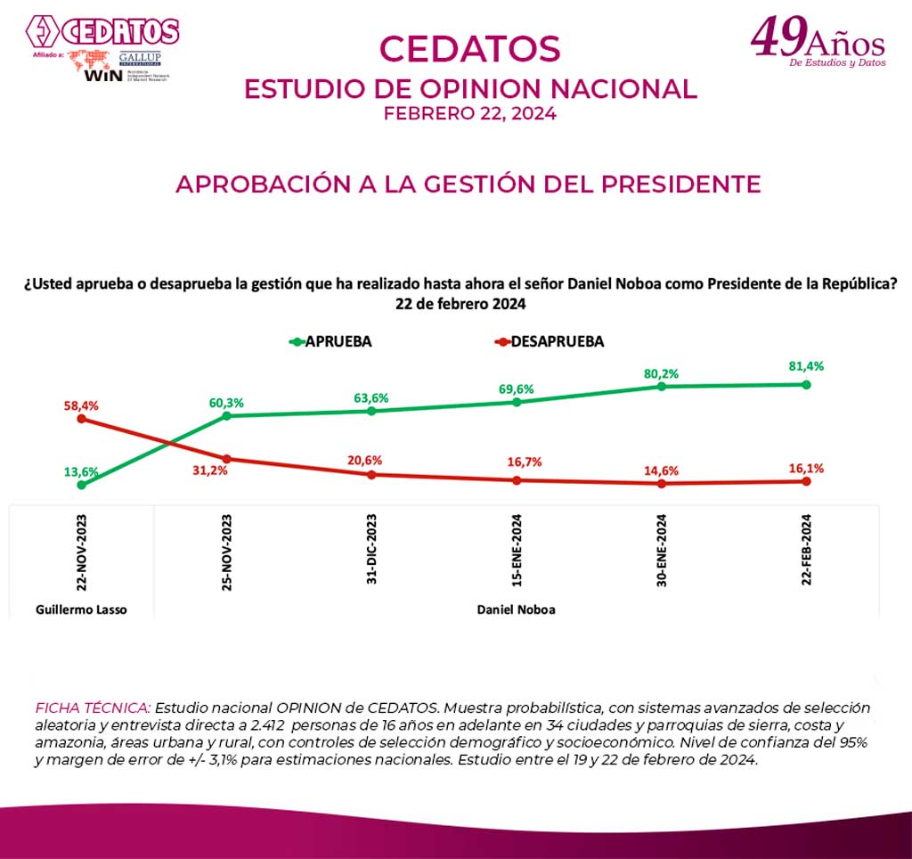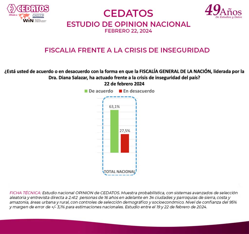 FICHA TÉCNICA: Estudio nacional OPINION de CEDATOS. Muestra probabilística, con sistemas avanzados de selección aleatoria y entrevista directa a 2.412 personas de 16 años en adelante en 34 ciudades y parroquias de sierra, costa y amazonia, áreas urbana y rural, con controles de selección demográfico y socioeconómico. Nivel de confianza del 95% y margen de error de +/- 3,1% para estimaciones nacionales. Estudio entre el 19 y 22 de febrero de 2024.