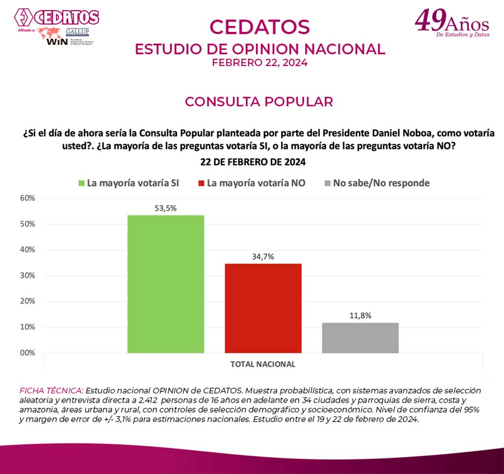 CEDATOS analizó una variedad de temas relacionados con la opinión pública de los ecuatorianos sobre la dirección en que va el país; los problemas que más preocupan; el nivel de aprobación y credibilidad en el gobierno, el Presidente y de más poderes del Estado, así como su nivel de confianza en las instituciones y autoridades a nivel nacional. Indagó sobre la posición de los ecuatorianos frente a la Consulta Popular y el Referéndum convocados por el presidente Noboa para el 21 de abril de 2024.