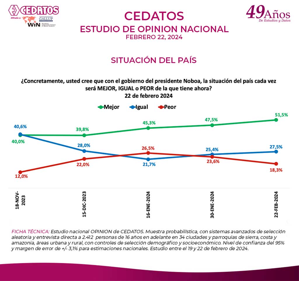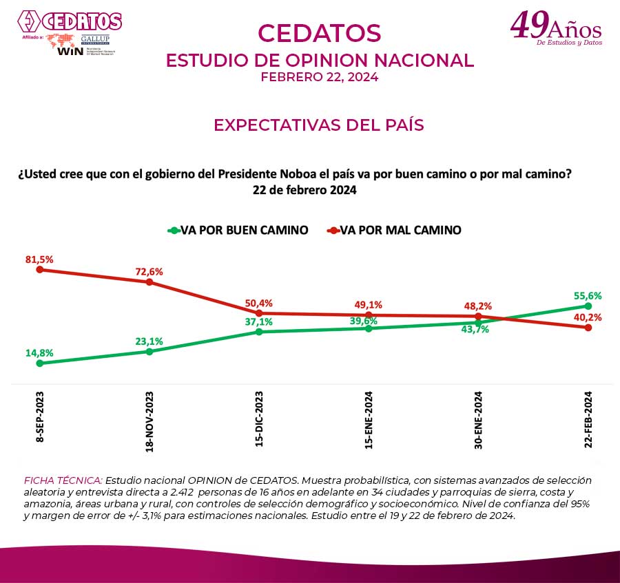 El 55.6% de la población estima que el país va por buen camino y el 40.2% que va por mal camino. El 51.5% considera que con el manejo del gobierno a cargo del presidente Daniel Noboa, la situación del país está mejor; que sigue igual dijo el 27.5% y para el 18,3%, está peor. Esto hace que el nivel de optimismo, entusiasmo y esperanza en el futuro haya subido al 52.3% frente al 46.5% de pesimismo.
