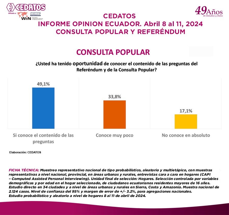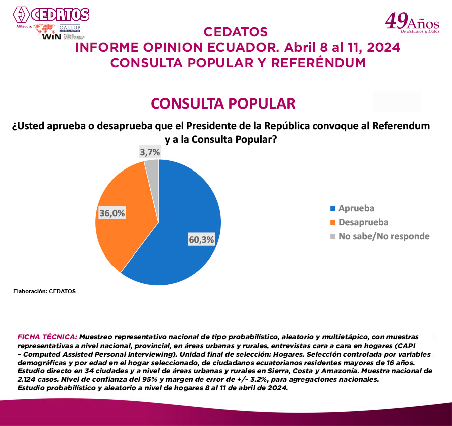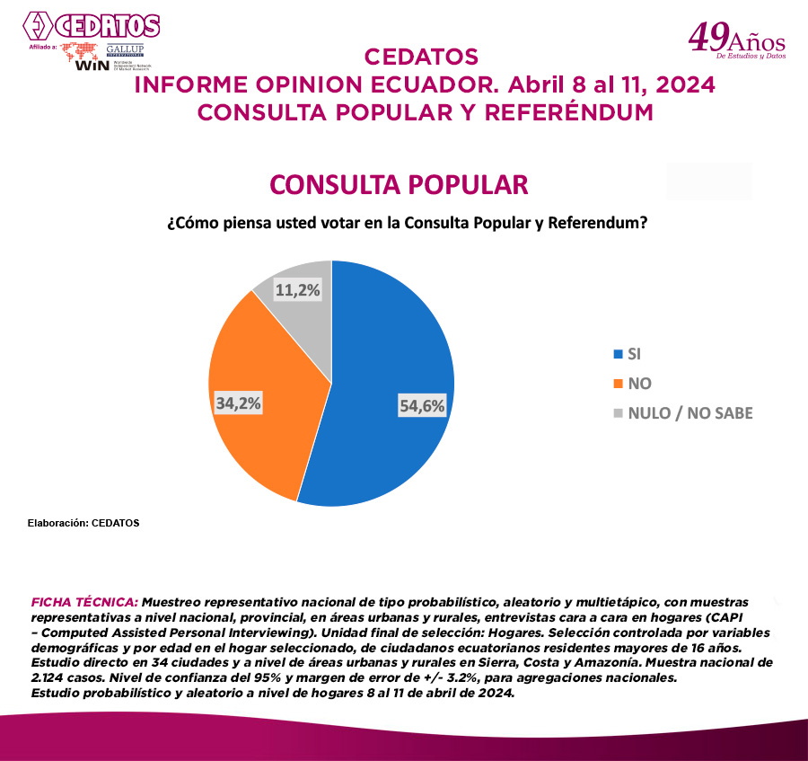 FICHA TÉCNICA: Muestreo representativo nacional de tipo probabilístico, aleatorio y multietápico, con muestras representativas a nivel nacional, provincial, en áreas urbanas y rurales, entrevistas cara a cara en hogares (CAPI – Computed Assisted Personal Interviewing). Unidad final de selección: Hogares. Selección controlada por variables demográficas y por edad en el hogar seleccionado, de ciudadanos ecuatorianos residentes mayores de 16 años. Estudio directo en 34 ciudades y a nivel de áreas urbanas y rurales en Sierra, Costa y Amazonía. Muestra nacional de 2.124 casos. Nivel de confianza del 95% y margen de error de +/- 3.2%, para agregaciones nacionales. Estudio probabilístico y aleatorio a nivel de hogares 8 al 11 de abril de 2024.