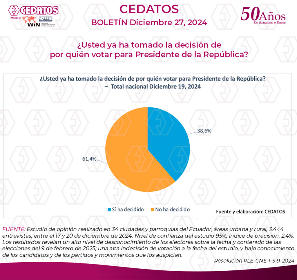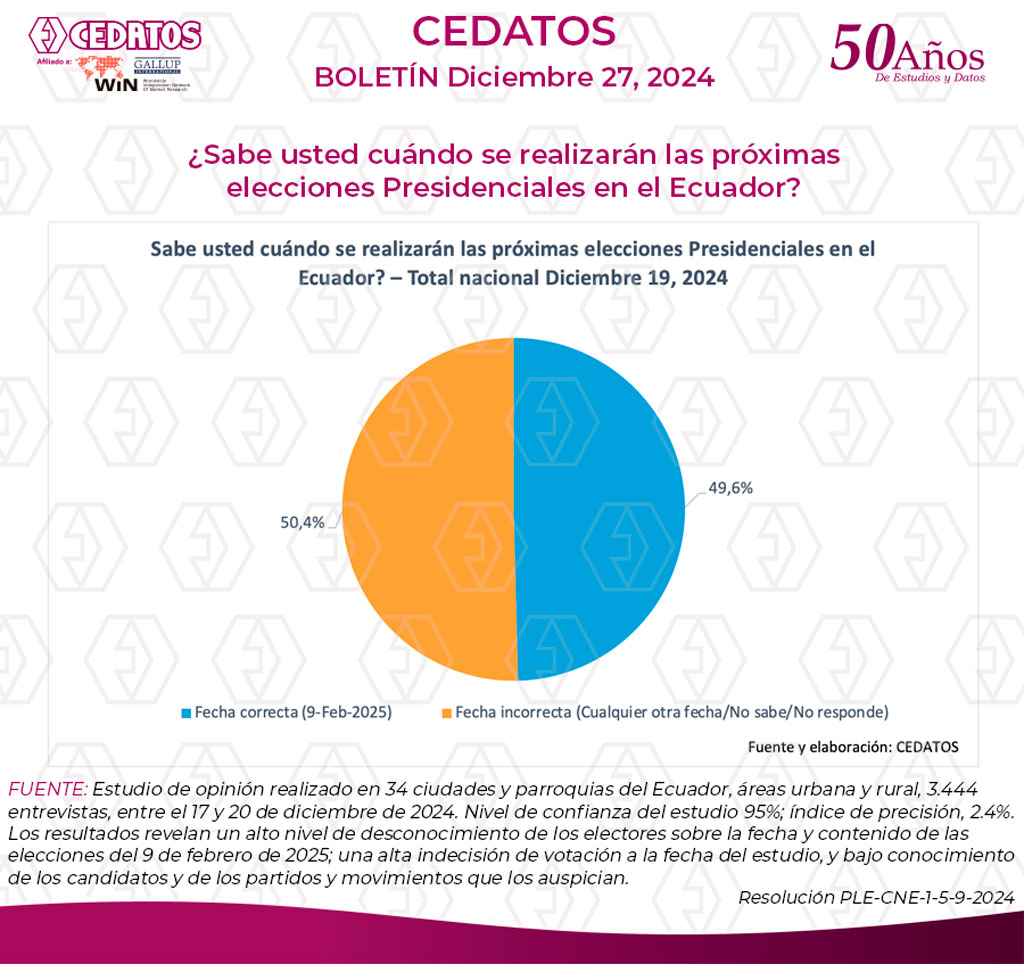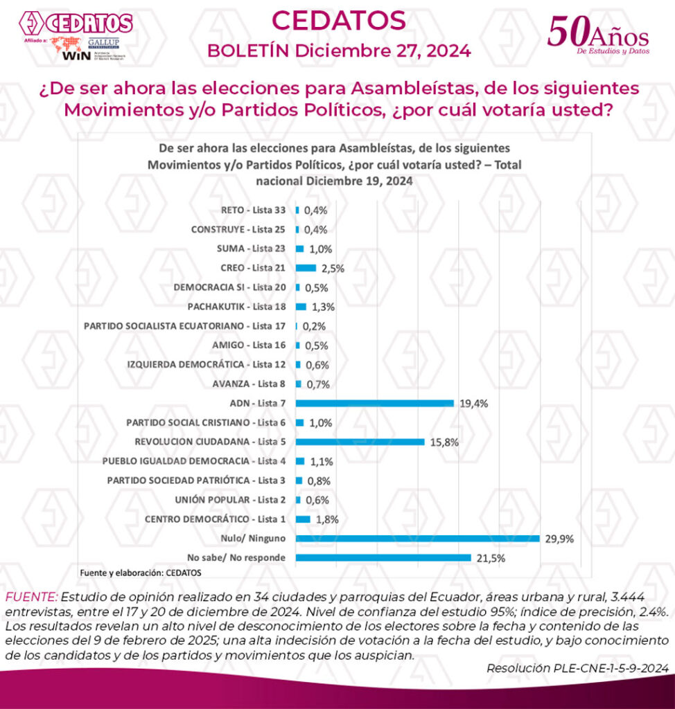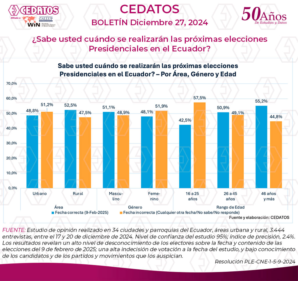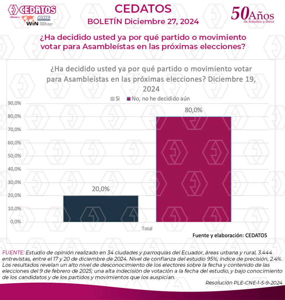 Fuente: Estudio de opinión realizado en 34 ciudades y parroquias del Ecuador, áreas urbana y rural, 3.444 entrevistas, entre el 17 y 20 de diciembre de 2024. Nivel de confianza del estudio 95%; índice de precisión, 2.4%. Los resultados revelan un alto nivel de desconocimiento de los electores sobre la fecha y contenido de las elecciones del 9 de febrero de 2025; una alta indecisión de votación a la fecha del estudio, y bajo conocimiento de los candidatos y de los partidos y movimientos que los