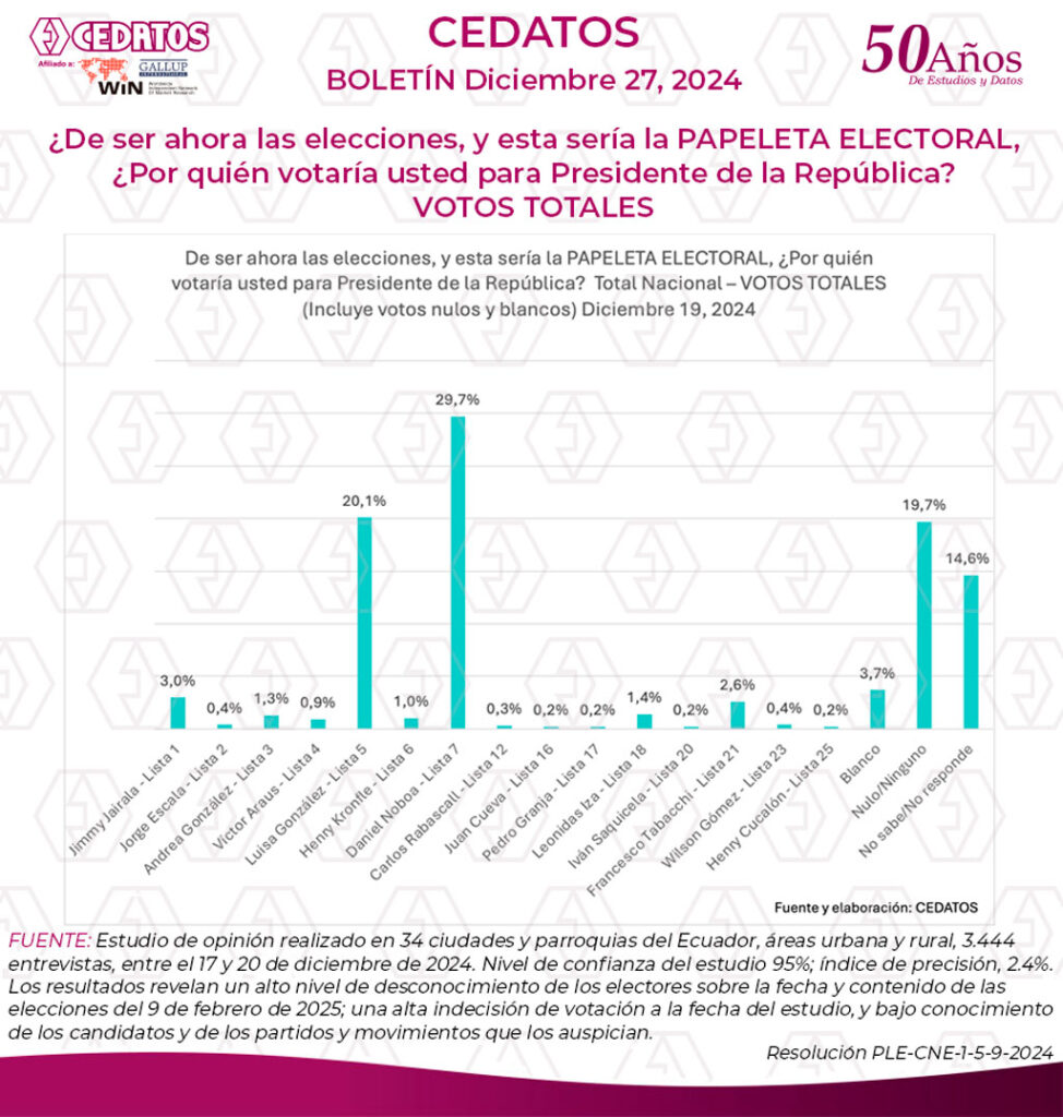 Con ficha técnica al 19 de diciembre de 2024, con un 61% de indecisión a nivel nacional, en un ejercicio de simulación con papeleta NO OFICIAL similar a la del CNE – en una muestra nacional de electores entrevistados en sus hogares, el voto válido que calcula el CNE, o sea sin considerar los votos nulos y blancos, Daniel Noboa alcanzó el 48% y Luisa González 32.5%; otros dos candidatos recibieron cifras alrededor del 4% y los doce candidatos restantes, cifras menores, 7 de ellos, menores al 1%. Estos resultados son aplicables al 19 de diciembre de 2024.