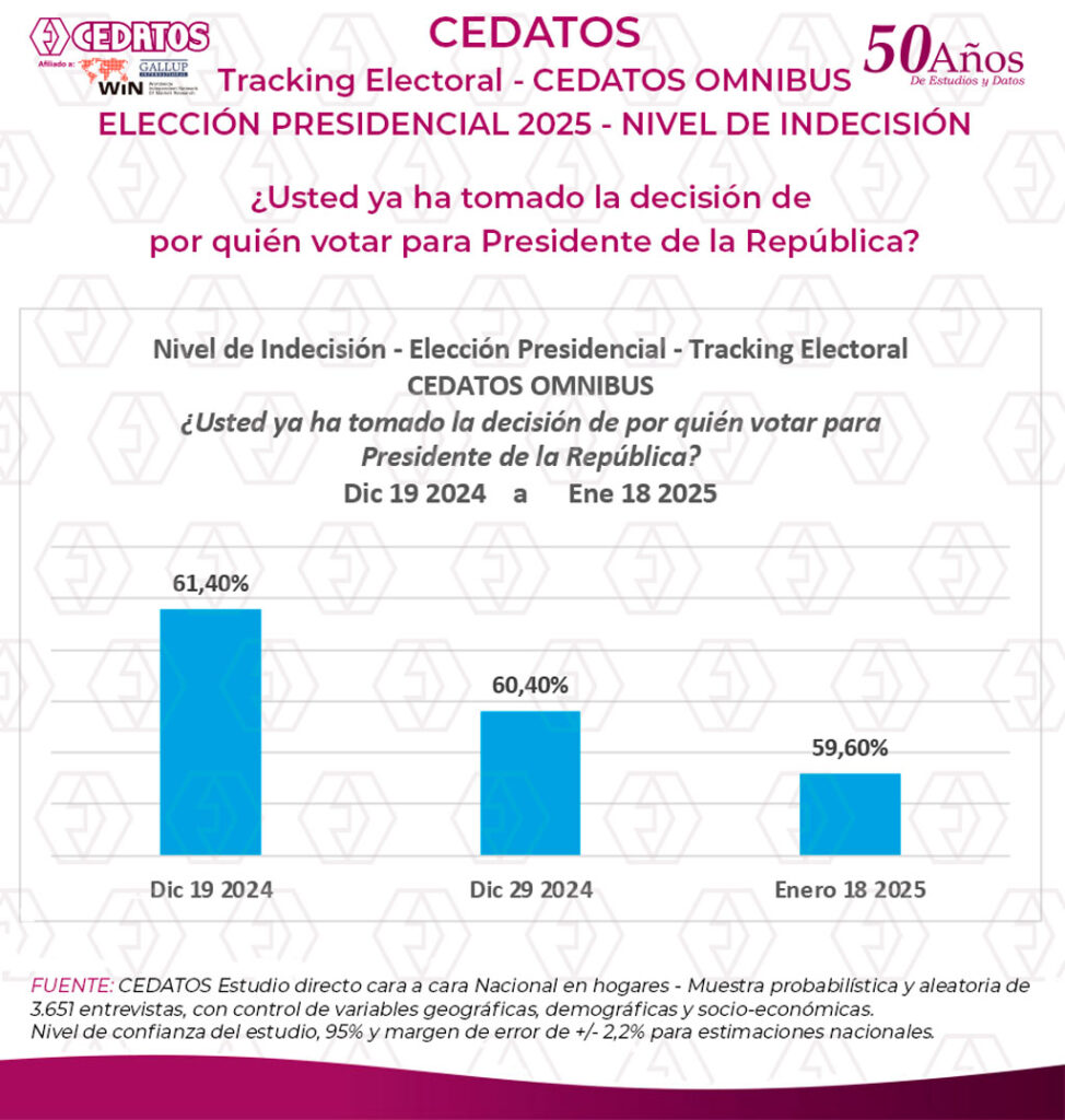 Los candidatos presidenciales se presentarán al Debate el día 19 de enero de 2025 con un nivel de indecisión nacional de 59.6% de acuerdo con el estudio de tracking electoral desarrollado por CEDATOS WIN GIA, cerrado al 18 de enero de 2025. La indecisión bajó un 1,8%, a menos de 3 semanas del día de la elección.