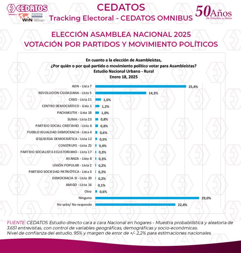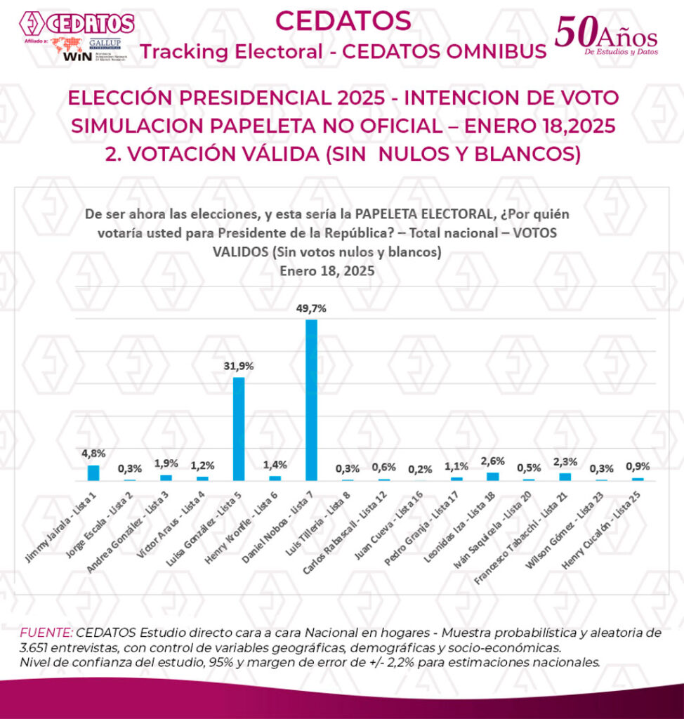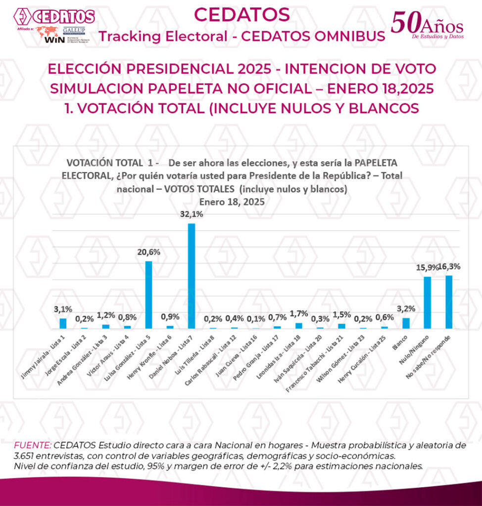 El último estudio nacional de CEDATOS sobre el proceso electoral, se cerró el 18 de enero de 2025, con entrevista cara a cara en hogares, papeleta no oficial, en áreas urbanas y rurales, en 24 localidades urbanas y rurales, con muestra probabilística y aleatoria de 3.651 entrevistas, con control de variables geográficas, demográficas y socio-económicas. Nivel de confianza del estudio, 95% y margen de error de +/- 2,2% para estimaciones nacionales.