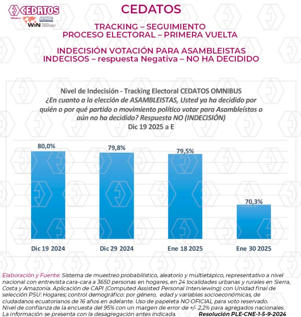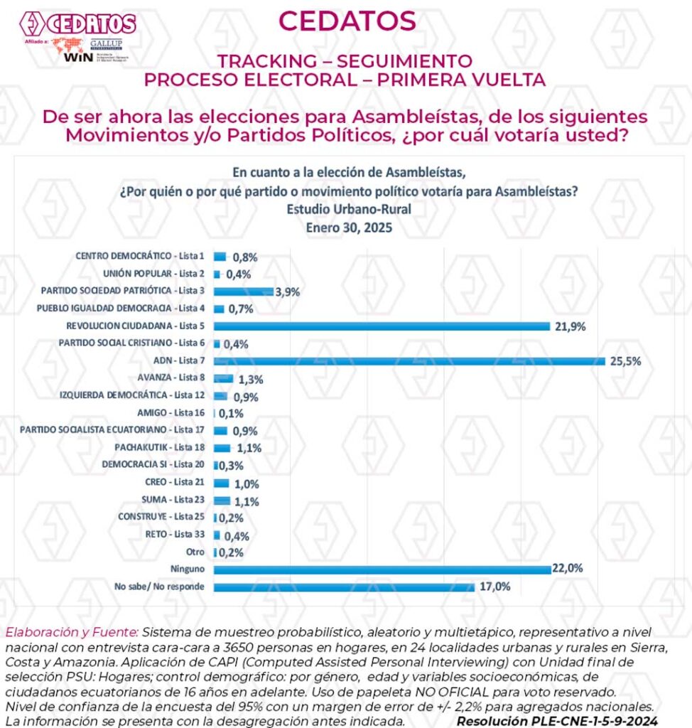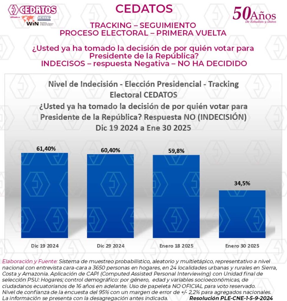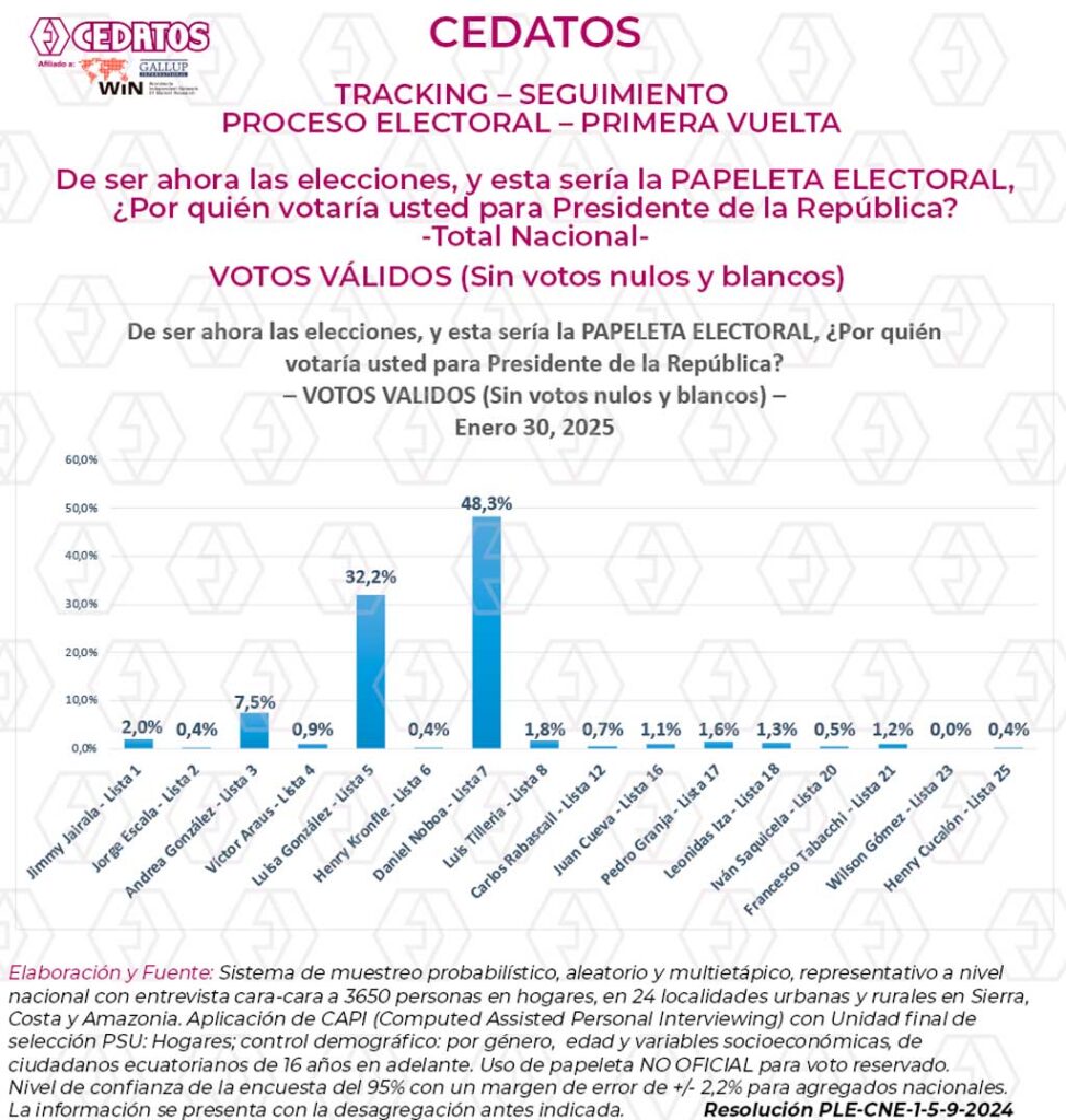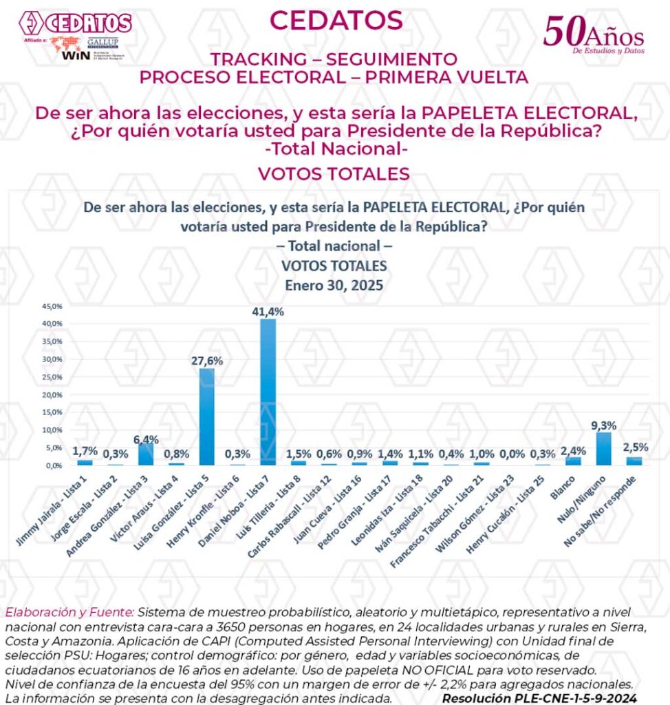 Estudio de Opinión Electoral referente a las elecciones del 9 de febrero de 2025 para Presidente de la República y Asambleístas Nacionales. Cerrado al 30 de enero de 2025 y tomado con selección probabilística de hogares de 24 ciudades y parroquias de sierra, costa y Amazonía, y entrevista cara a cara a 3.640 electores con representación por género, edad y variables socioeconómicas.