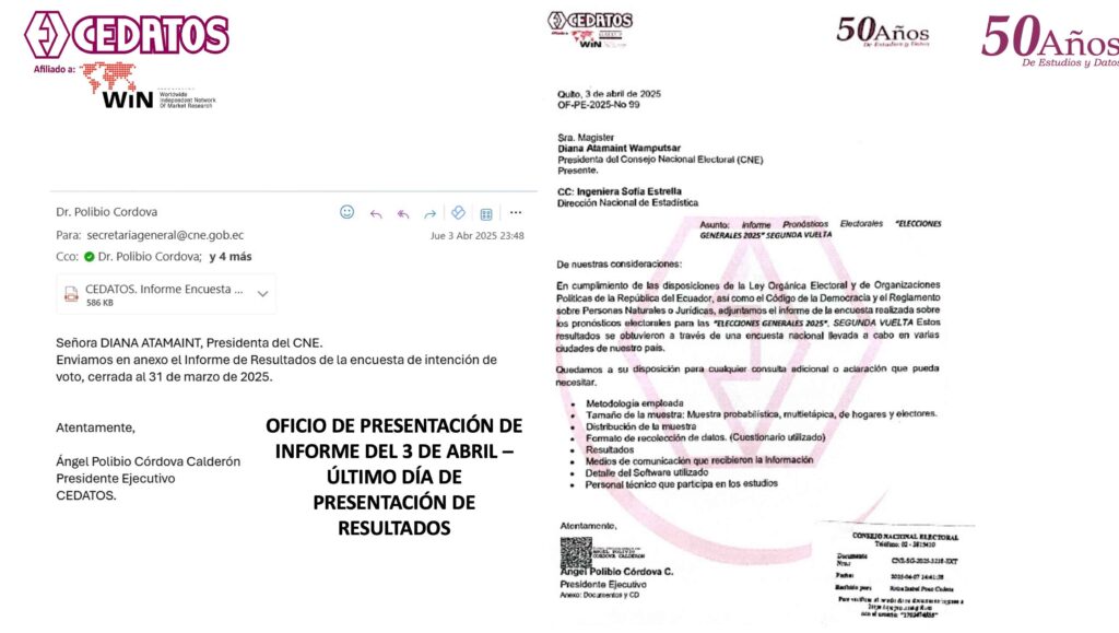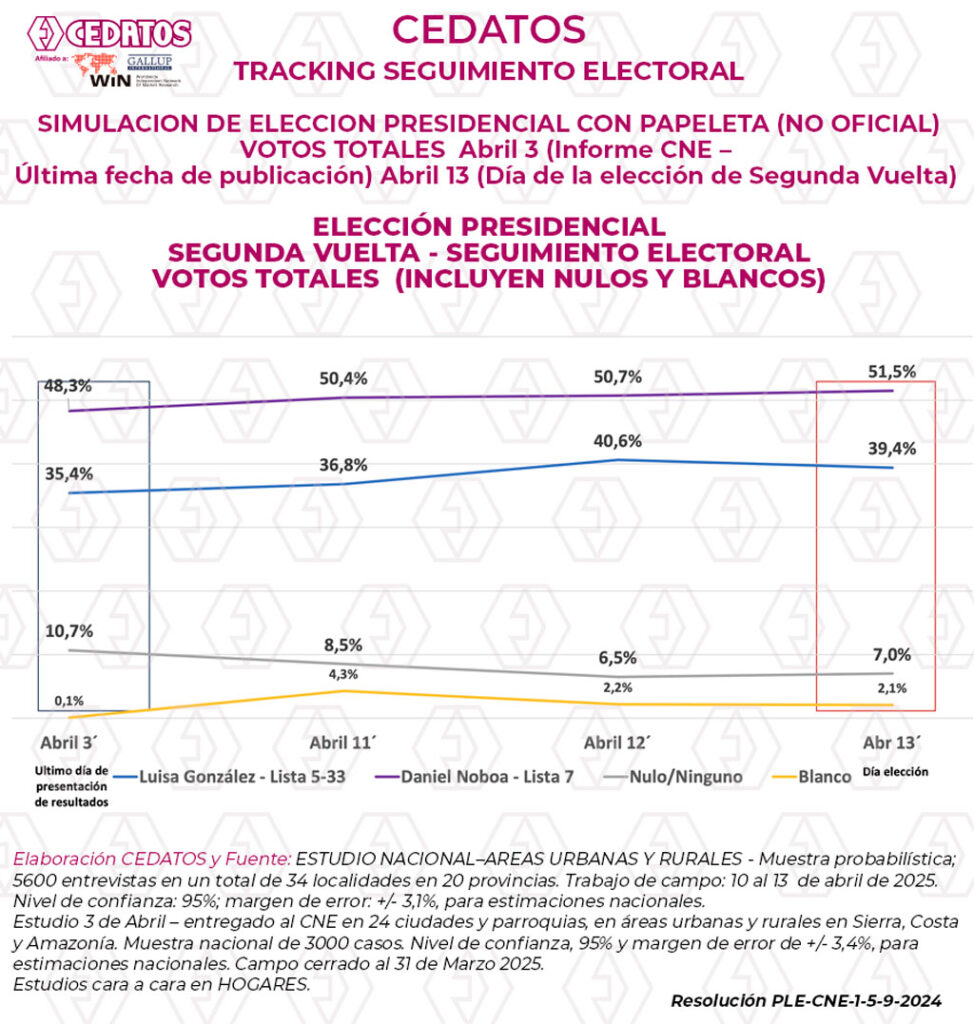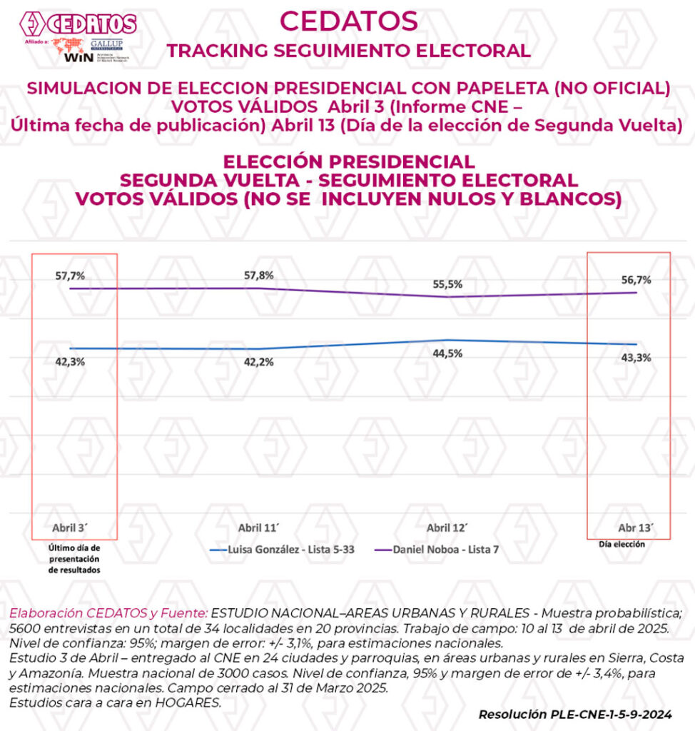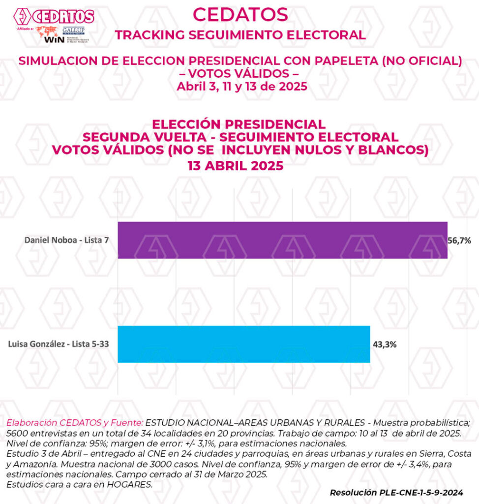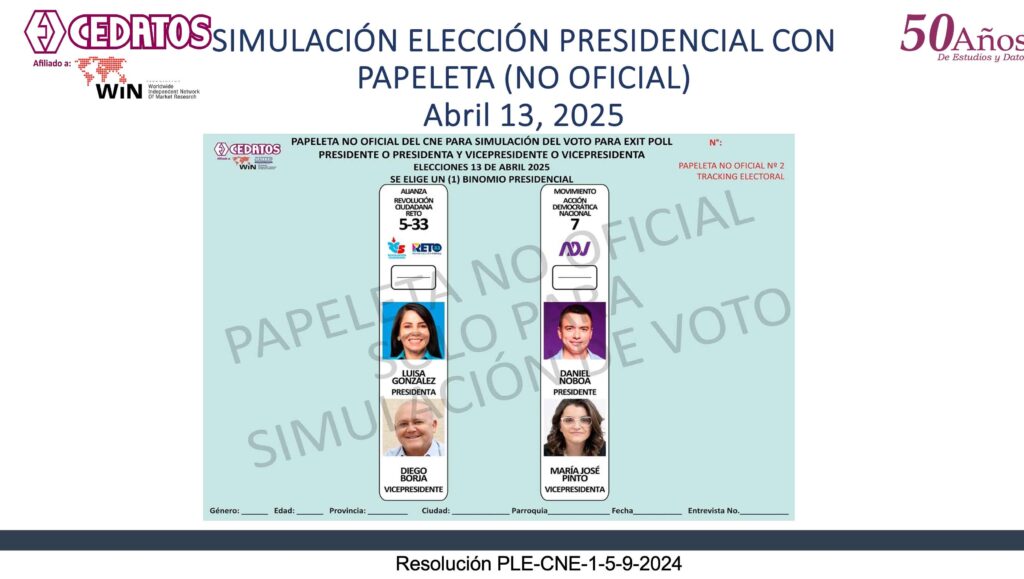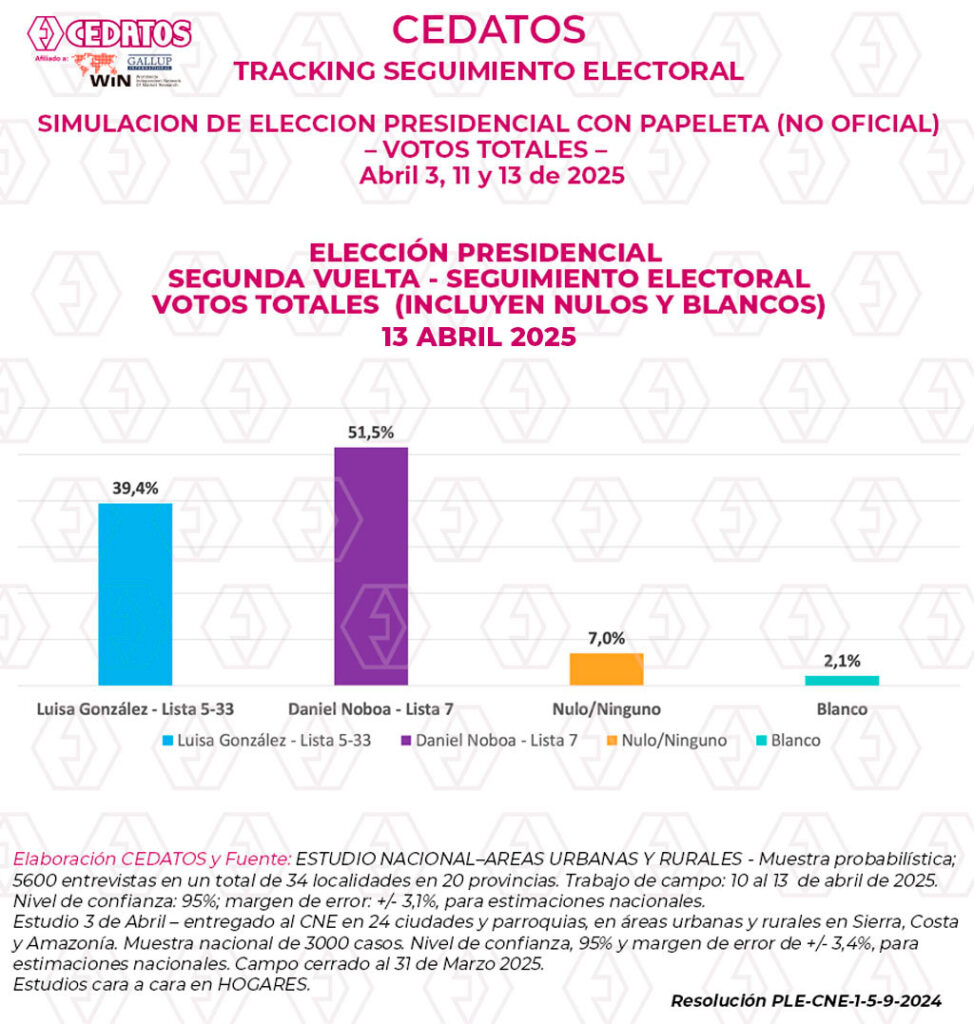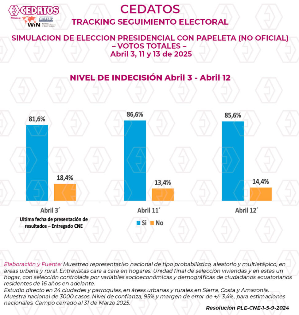 •Estudio 3 de Abril – entregado al CNE en 24 ciudades y parroquias, en áreas urbanas y rurales en Sierra, Costa y Amazonía. Muestra nacional de 3000 casos. Nivel de confianza, 95% y margen de error de +/- 3,4%, para estimaciones nacionales. Campo cerrado al 31 de Marzo 2025. Estudios cara a cara en HOGARES.