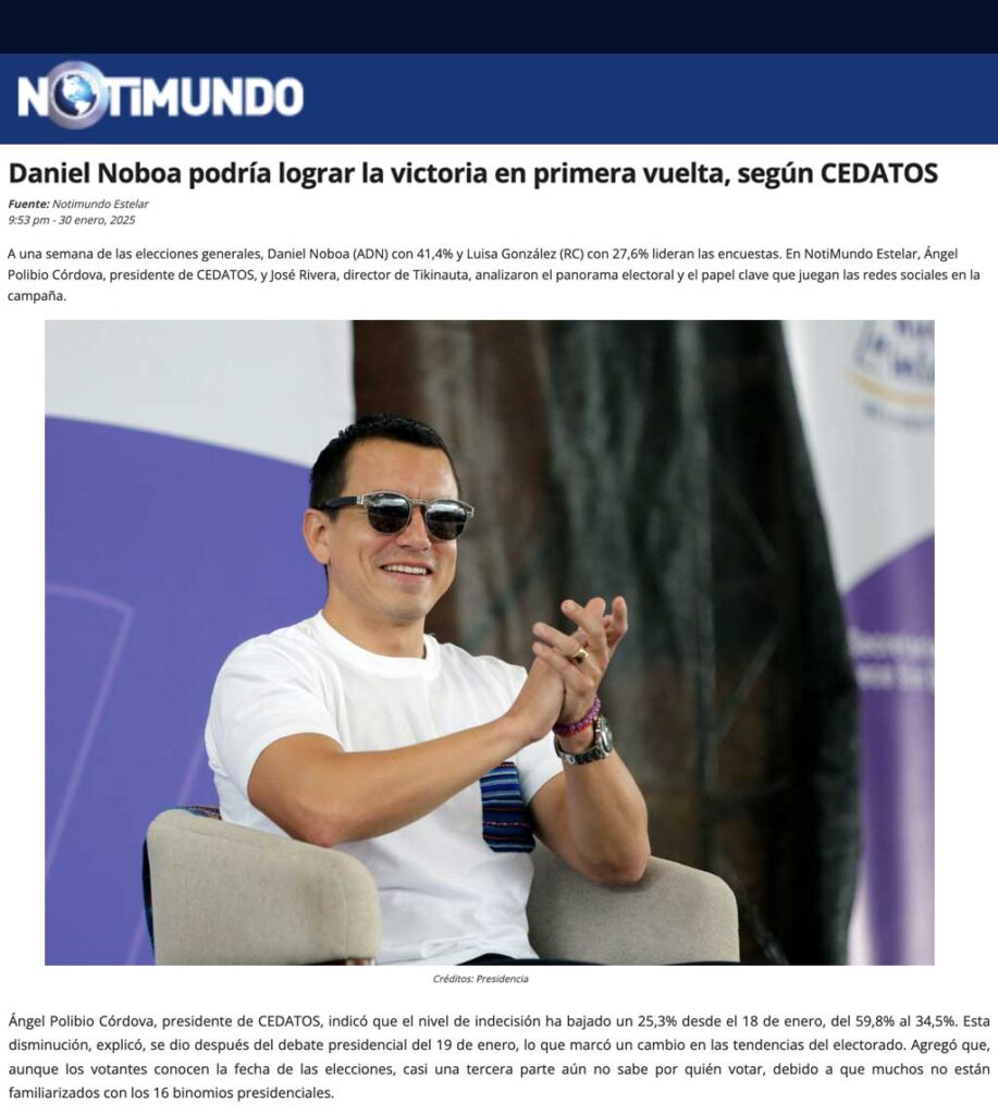 (VIDEO) CEDATOS EN LOS MEDIOS | NOTIMUNDO – Daniel Noboa podría lograr la victoria en primera vuelta, según CEDATOS