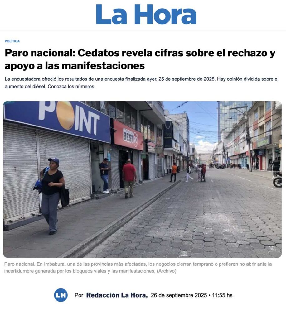 CEDATOS EN LOS MEDIOS – DIARIO LA HORA – Paro nacional: Cedatos revela cifras sobre el rechazo y apoyo a las manifestaciones