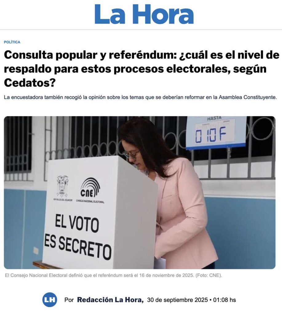 CEDATOS EN LOS MEDIOS – DIARIO LA HORA -Consulta popular y referéndum: ¿cuál es el nivel de respaldo para estos procesos electorales, según Cedatos?