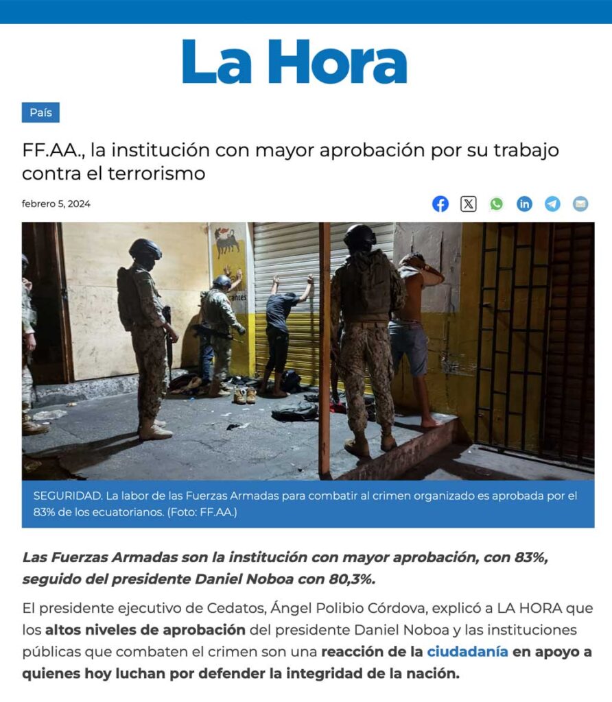 CEDATOS EN LOS MEDIOS | LA HORA – FF.AA., la institución con mayor aprobación por su trabajo contra el terrorismo