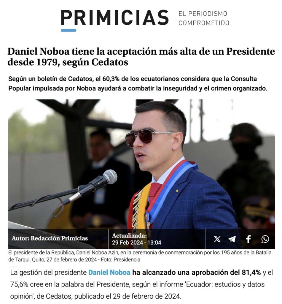 CEDATOS EN LOS MEDIOS | Daniel Noboa tiene la aceptación más alta de un Presidente desde 1979, según Cedatos